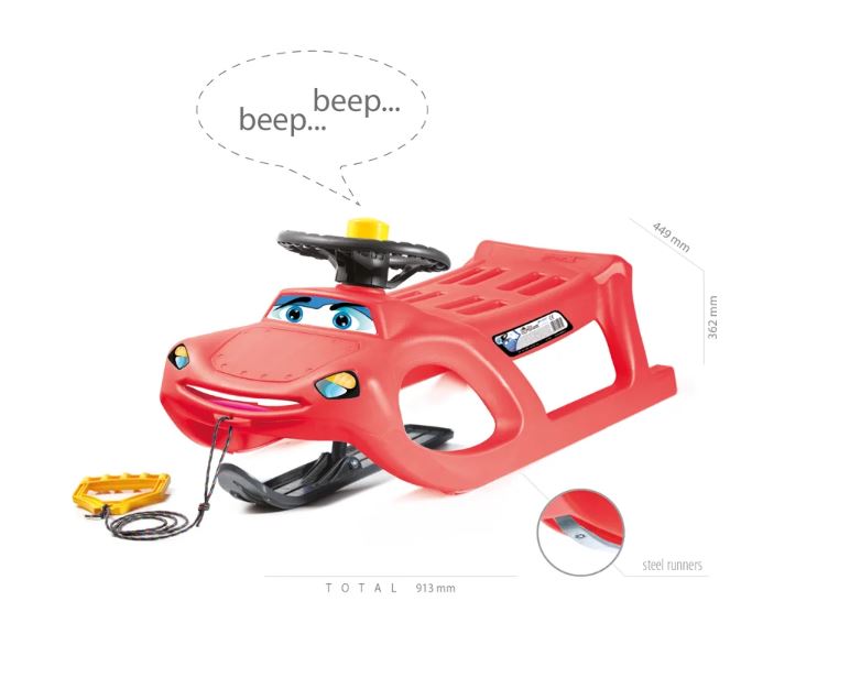 Wesoły wzór na sankach i efekty dźwiękowe w kierownicy dodadzą frajdy każdemu zimowemu wyjściu. Dzięki stalowym płozom ciągnięcie sanek po śniegu nie sprawi Ci problemu, a dołączona do zestawu linka z wygodnym uchwytem ułatwi wspólne zimowe spacery.