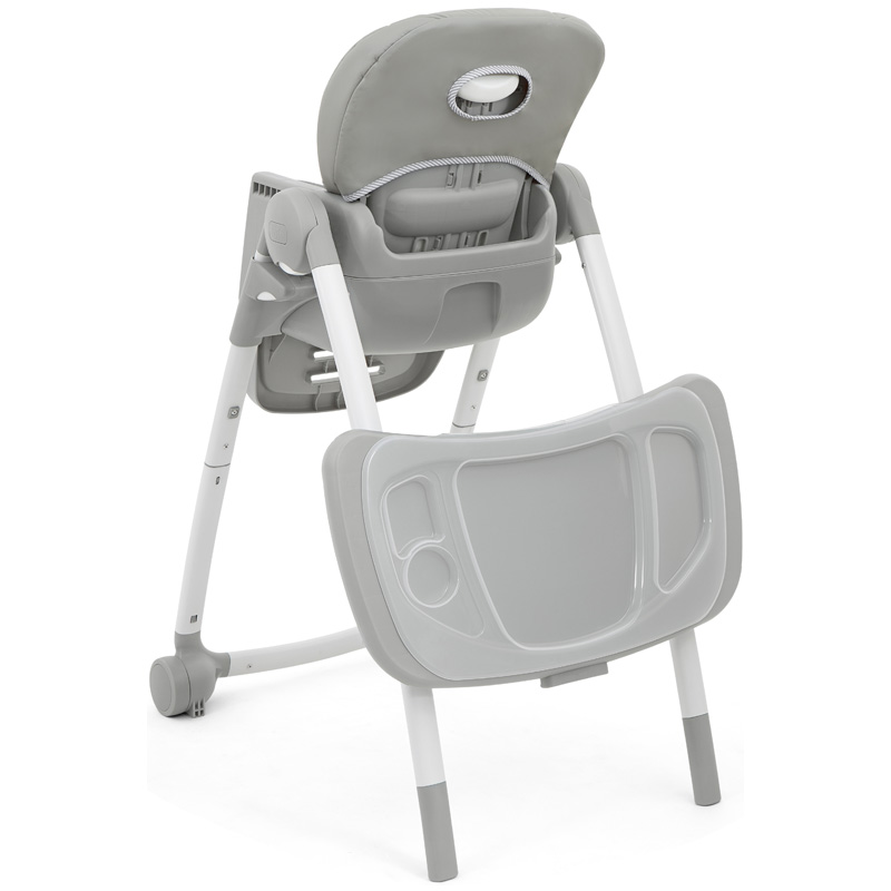 Duża tacka z osobnym miejscem na kubek z możliwością wypięcia i 3-stopniową regulacją jedną ręką. Nakładka na tackę nadaje się do mycia w zmywarce. Możliwość przechowywania nieużywanej tacki na tylnych nogach krzesełka.
