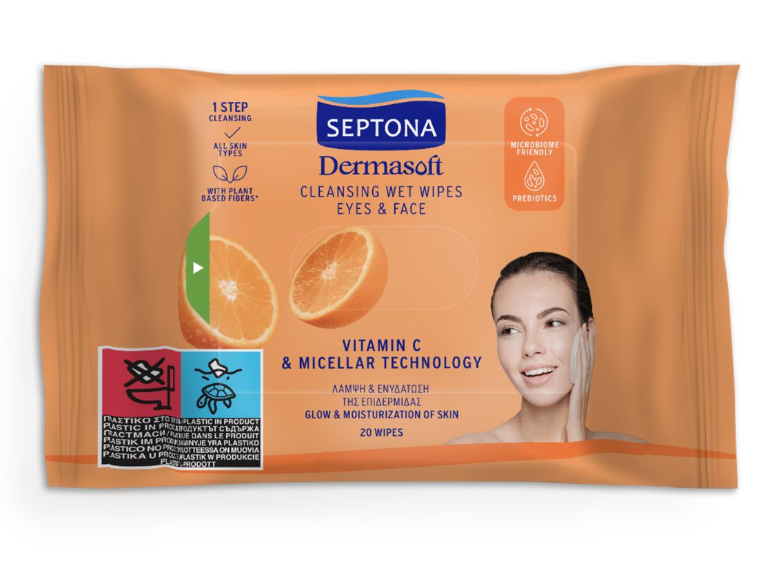 Septona Dermasoft Oczyszczające Chusteczki Nawilżane z Witaminą C i Technologią Micelarną Do Twarzy i Oczu 20szt.