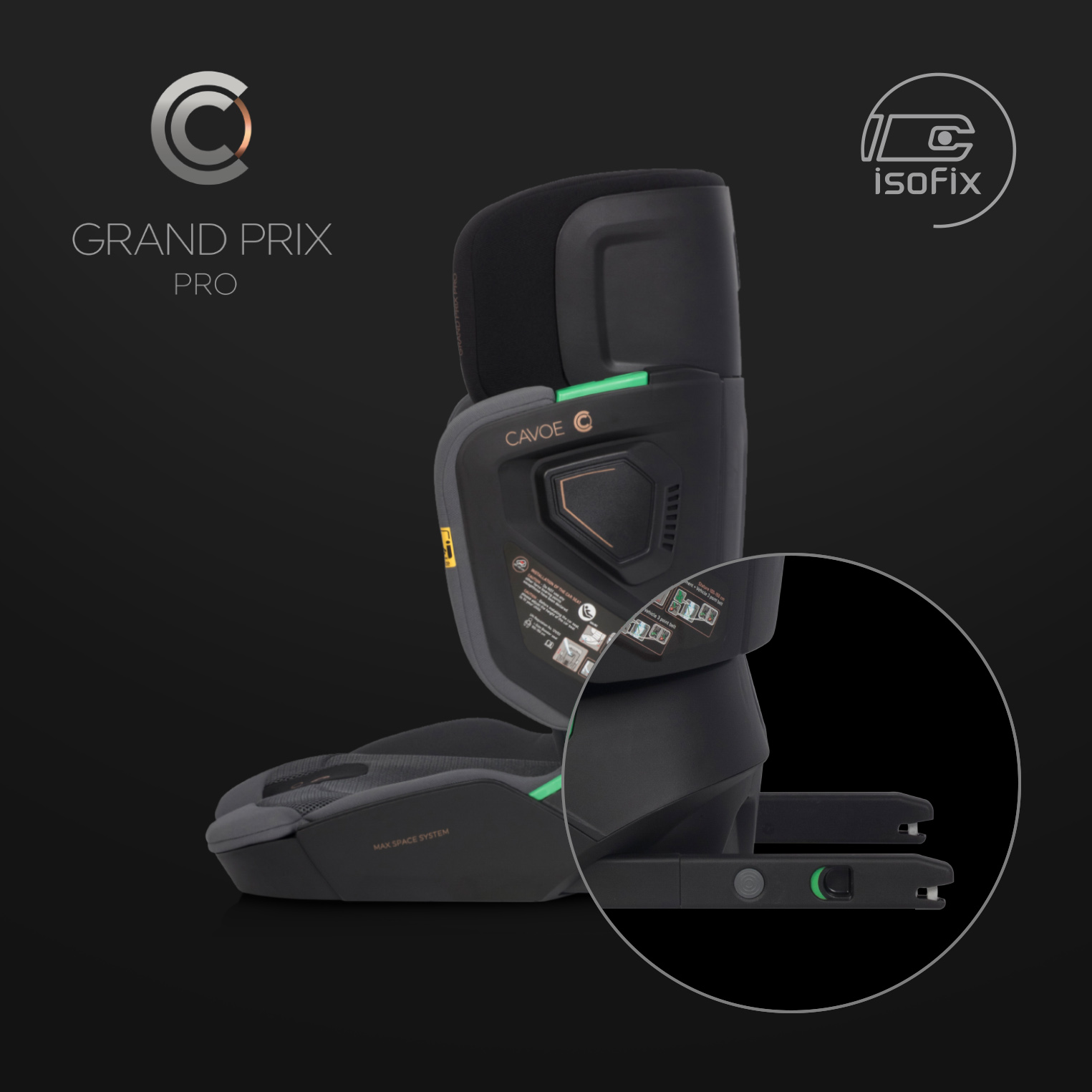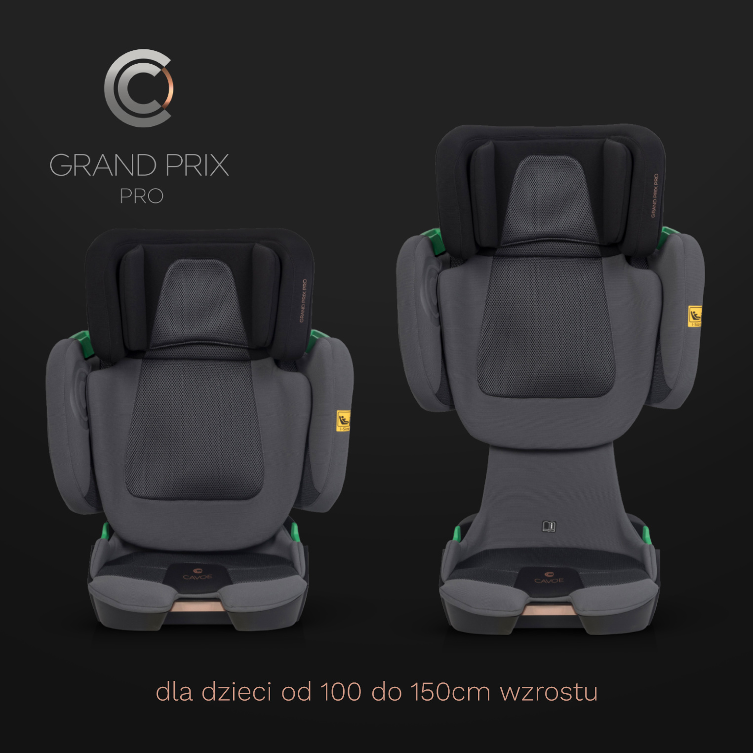 Fotelik samochodowy GRAND PRIX PRO marki CAVOE przeznaczony jest dla dzieci o wzroście od 100 do 150 cm (czyli mniej więcej od 15 do 36 kg) zgodnie z normą ECE R129 I-SIZE. Montaż w samochodzie odbywa się za pomocą systemu ISOFIX. Dodatkowo dziecko razem z fotelikiem należy zabezpieczyć samochodowymi pasami bezpieczeństwa zgodnie z instrukcją obsługi.