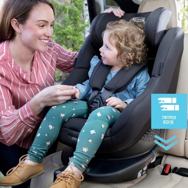 Siedzisko obraca się w promieniu 360 ° zapewniając łatwość użytkowania, wygodne wkładanie i wyjmowanie dziecka z foteliką oraz dostęp do niego podczas podróży.