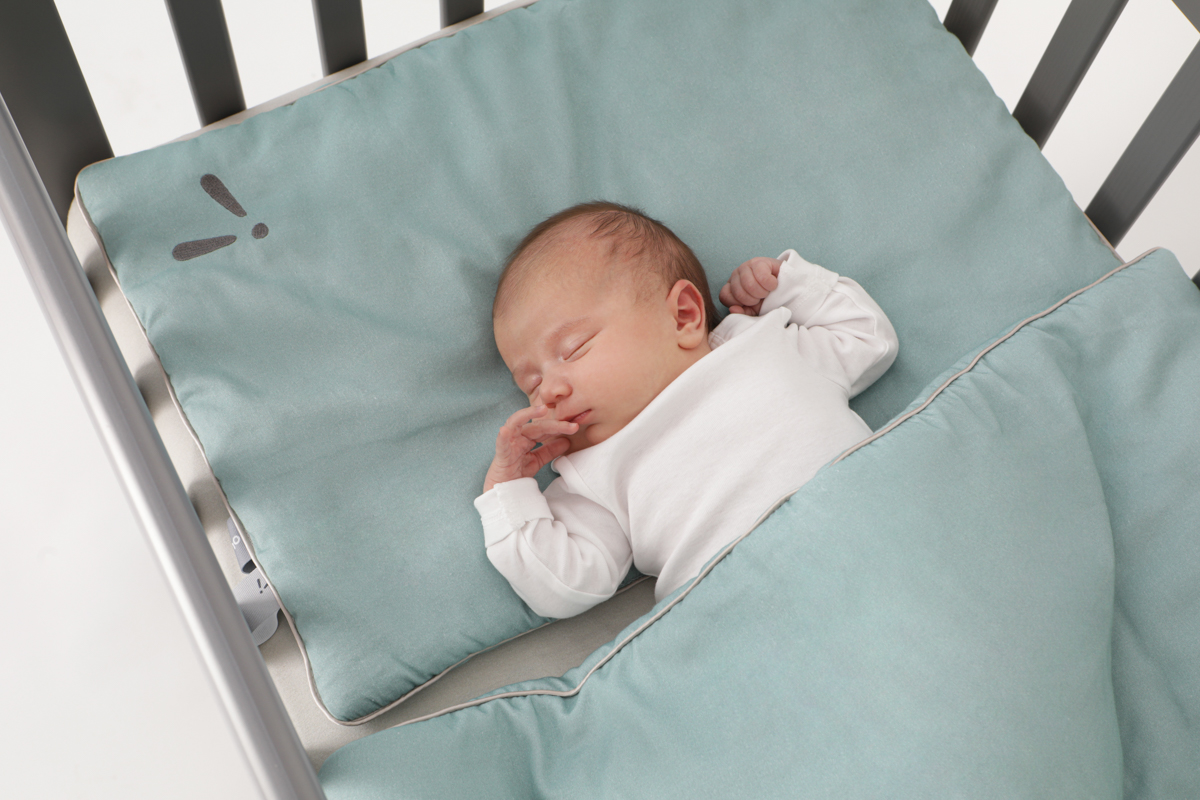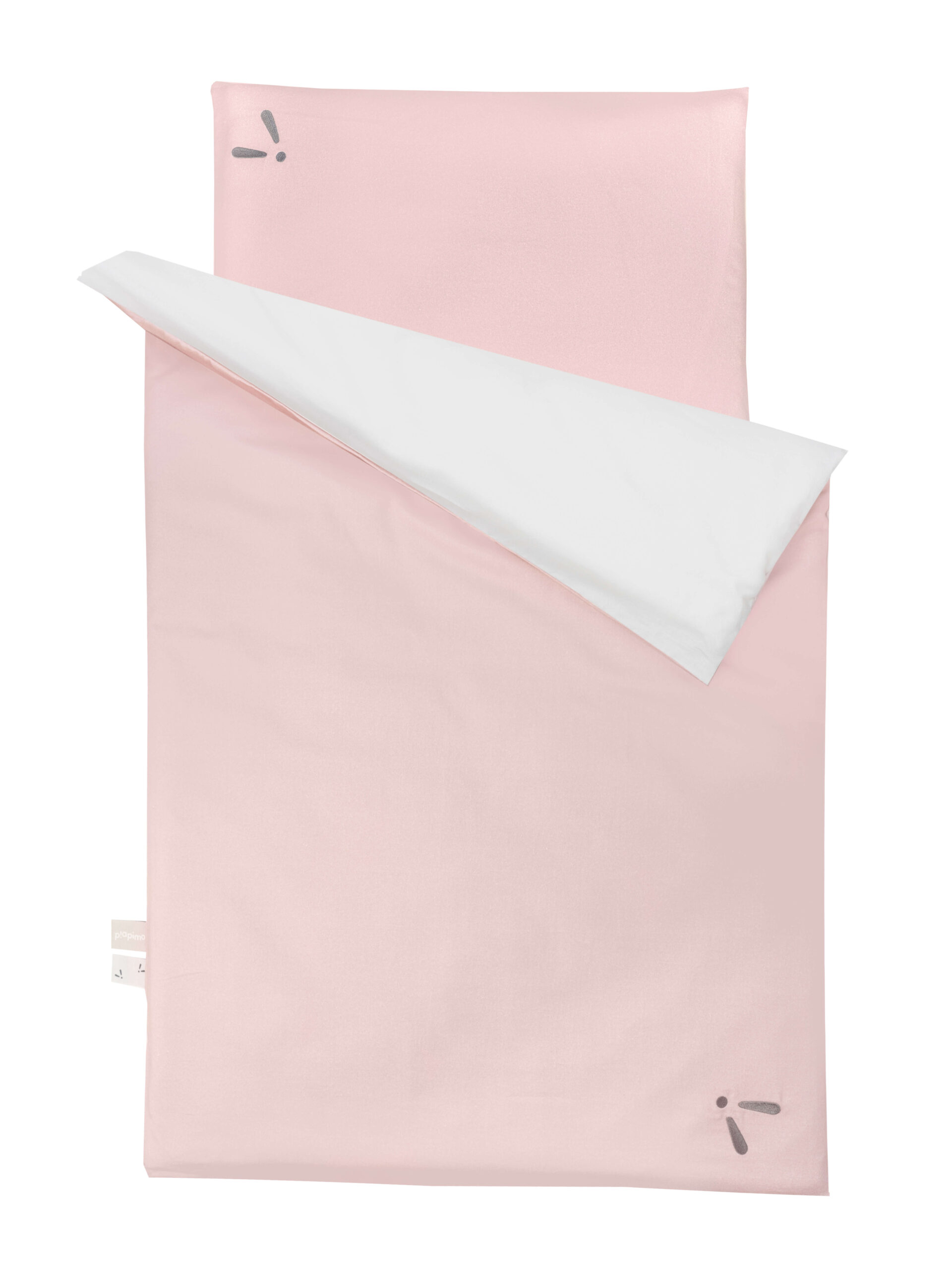 Delikatne, bezpieczne dla skóry niemowlęcia powłoczki z gładkiej bawełny satynowej wypełniliśmy hipoalergicznym włóknem poliestrowym, uzyskując lekką kołderkę (80 x 100 cm) i jeszcze lżejszą płaską poduszeczkę (40 x 60 cm).