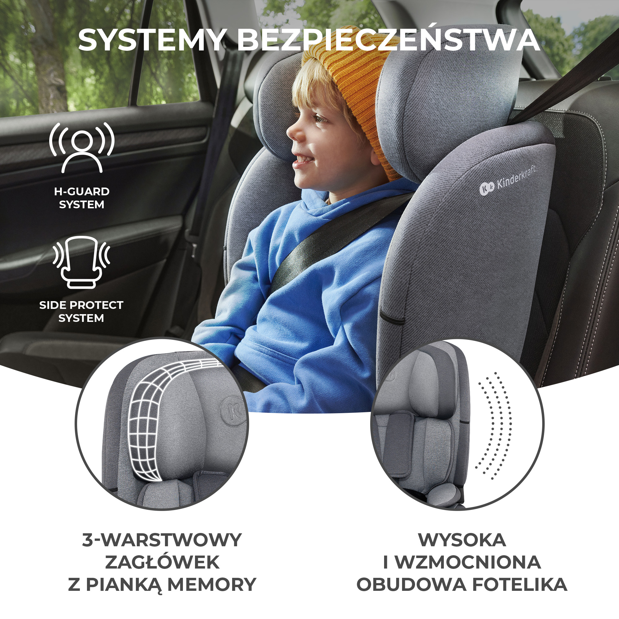 Fotelik ma wysokie, wzmocnione osłony boczne (SPS), które absorbują energię, wytworzoną podczas zderzeń bocznych. Za ochronę głowy odpowiada H-GUARD SYSTEM, 3-warstwowy zagłówek z pianką memory, który rozprasza siły, wytworzone podczas wypadku, nie dopuszczając ich do dziecka.