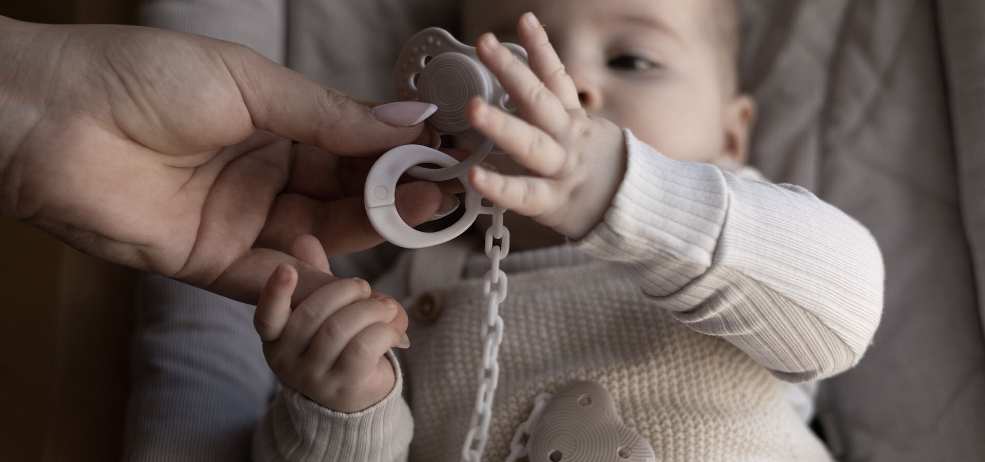 Łańcuszek do smoczka LOVI wyposażony jest w bardzo praktyczny klips umożliwiający bezpieczne i stabilne przymocowanie smoczka do ubranka dziecka.