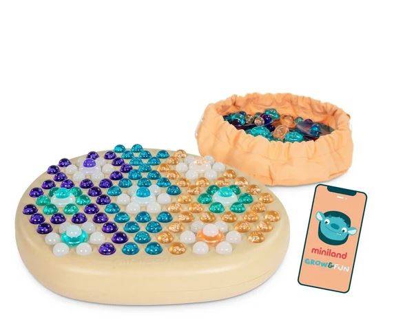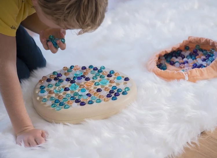 Ta zabawka to wielki „otoczak”, na którym najmłodsi mogą tworzyć wzory z błyszczących koralików o różnych kształtach i kolorach. Przypomina to tradycyjną zabawę w malowanie mandali, która rozwija kreatywność i wzmacnia skupienie, działając odprężająco.