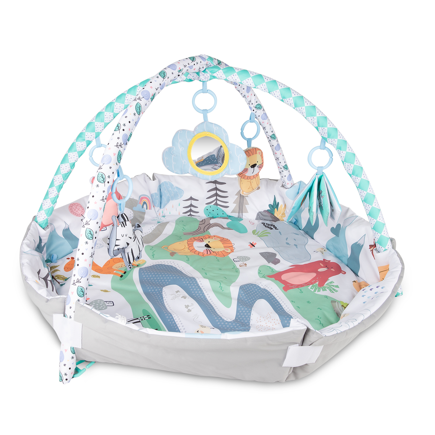 Edukacyjna mata do zabawy SAFARI to rozwiązanie 3w1, które rośnie razem z dzieckiem i może służyć jako kojec, mata edukacyjna z zabawkami na pałąkach lub po prostu mata bez dodatkowych akcesoriów. Tak wiele możliwości sprawia, że mata zachęci dziecko do zabawy na długi czas. Zebra, lew i miś, książeczka oraz lusterko to przyjazne zawieszki, które zachęcają dziecko do aktywności i wyciągania do nich rączek, pomagając rozwijać sprawność ruchową, wzmacniać mięśnie i ćwiczyć zdolności manualne, a także wspomagając rozwój zmysłów poprzez zabawę – wzroku, słuchu i dotyku. Różne tekstury materiałów, kontrastowe kolory i łagodne dźwięki to świetna rozrywka dla rozwijających się zmysłów maluszka już od pierwszych chwil życia. Funkcja kojca, dzięki podnoszonym brzegom maty stwarza bezpieczną przestrzeń do zabawy dla dziecka, a rodzicowi pozwoli na chwilę dla siebie lub domowe obowiązki.
