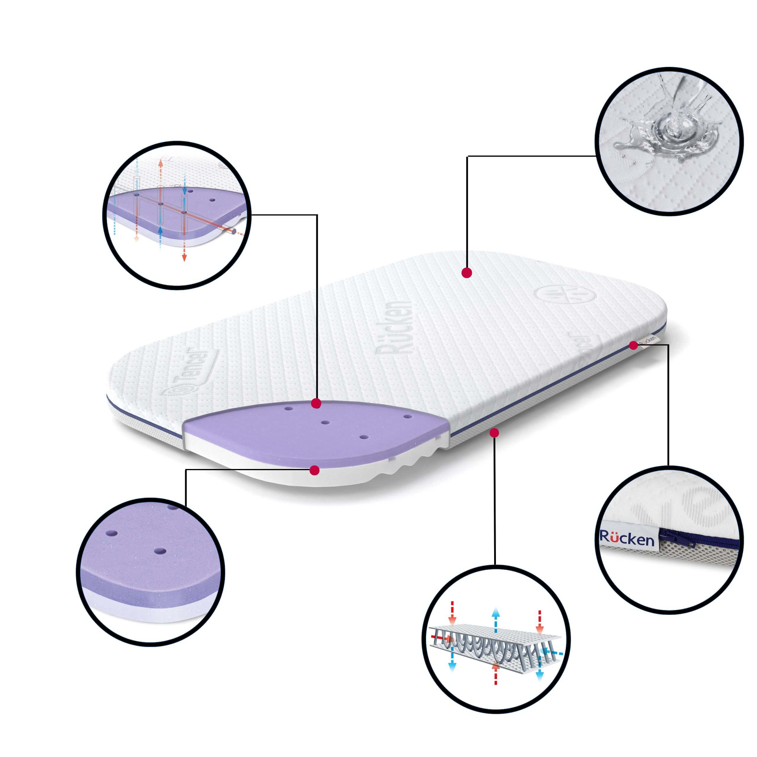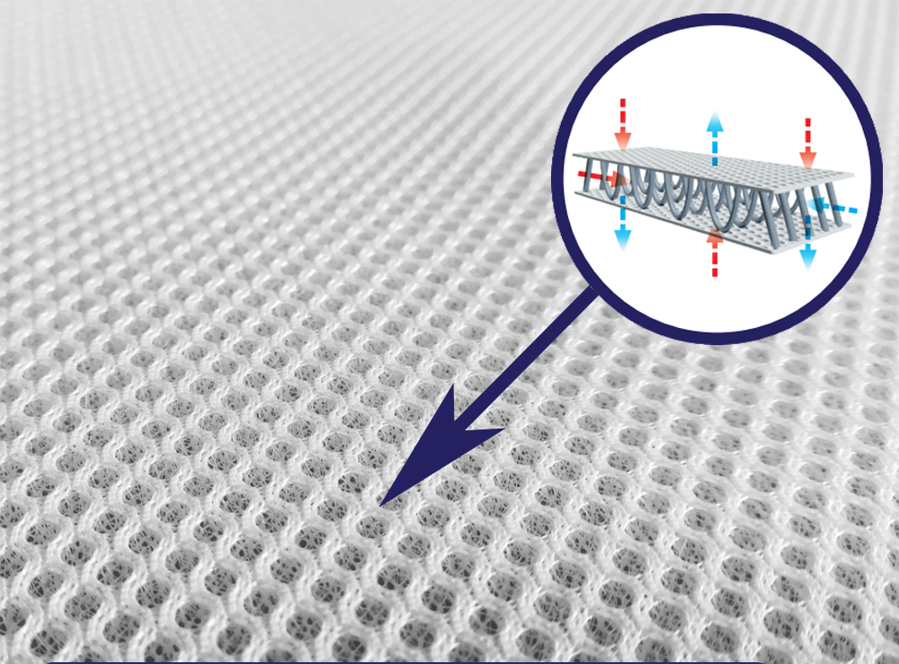 • prawdziwej siatki 3D z jednej strony pokrowca, która wzmacnia wentylację całego materaca: Swobodna wentylacja ułatwia utrzymanie komfortowej temperatury spania, ogranicza ilość niepotrzebnych wybudzeń, zmniejsza ryzyko rozwoju bakterii, zapewniając Twojemu dziecku zdrowy sen przez całą noc.