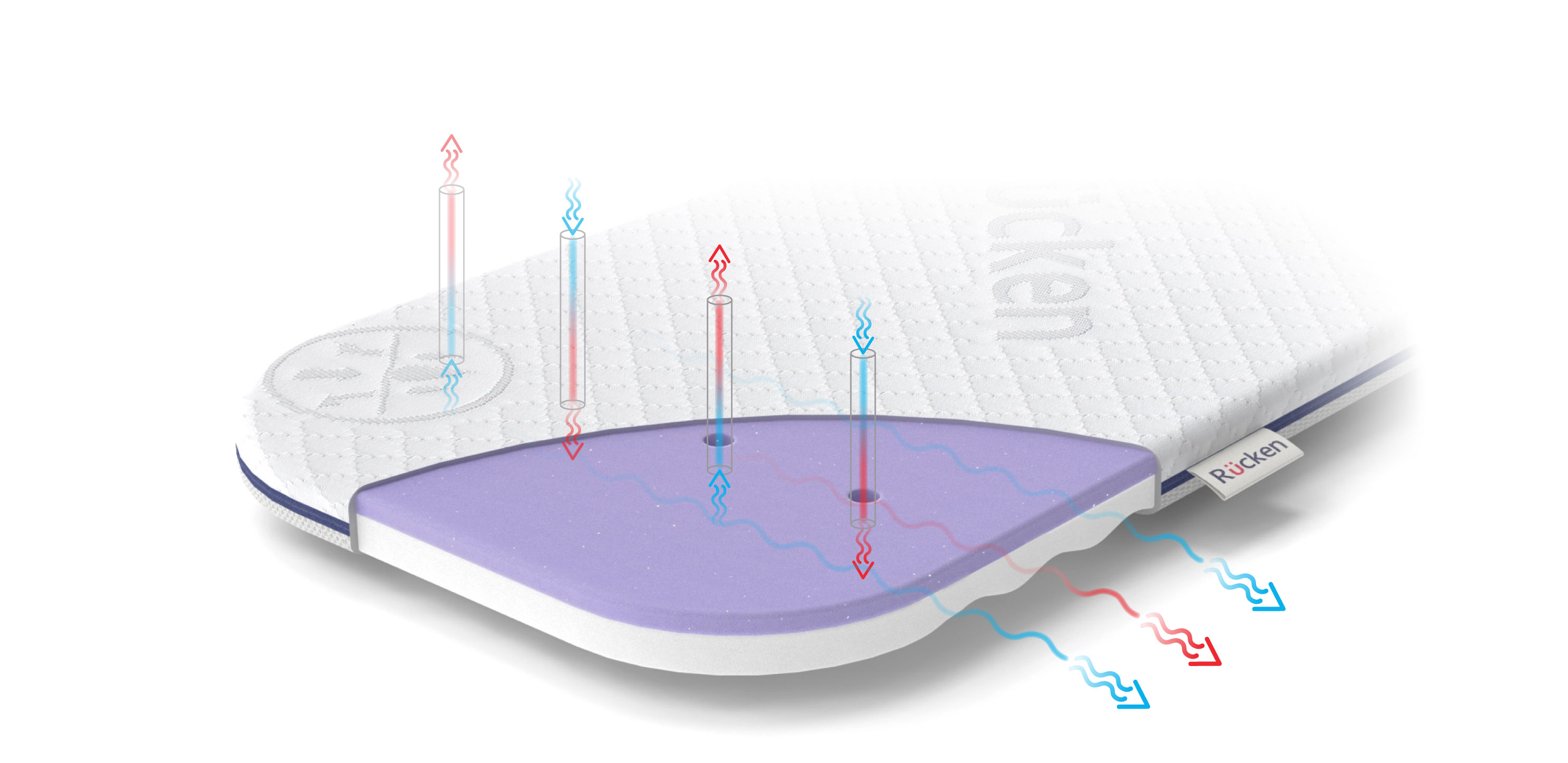 • pionowych kanalików wentylacyjnych: profilu fali nadanemu piance białej. Profil fali z wierzchniej strony zmniejsza twardość pianki po tej stronie z H3 do H2 oraz zapewnia doskonałą cyrkulację powietrza.