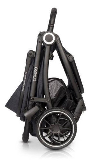 że spacerówka Euro-Cart Corso składa się do bardzo małych rozmiarów. Złożona nie tylko zachowuje swoją formę dzięki zabezpieczeniu, lecz również samodzielnie stoi, co chroni tapicerkę przed kontaktem z podłożem. Pałąk bezpieczeństwa pełni po złożeniu rolę uchwytu, dzięki czemu możesz przenosić swój wózek Corso niczym walizkę.