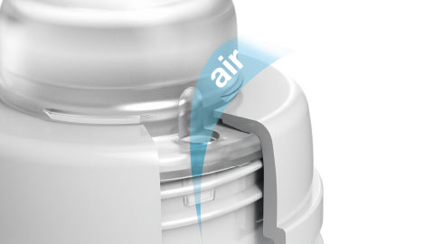 Zmniejsza ryzyko kolki. Zaworek odpowietrzający zapobiega zasysaniu i zapadaniu się smoczka, zmniejszając ryzyko wystąpienia kolki.