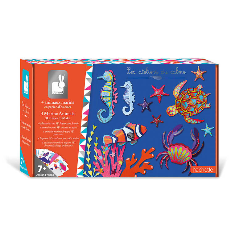 Zestaw kreatywny 4 zwierzęta morskie z papieru 3D francuskiej marki JANOD pozwoli stworzyć łącznie 4 rodzaje morskich żyjątek (koniki morskie, kraba, żółwia i rybkę) i inne elementy ich podwodnego świata (rozgwiazdy, koralowce, wodorosty).