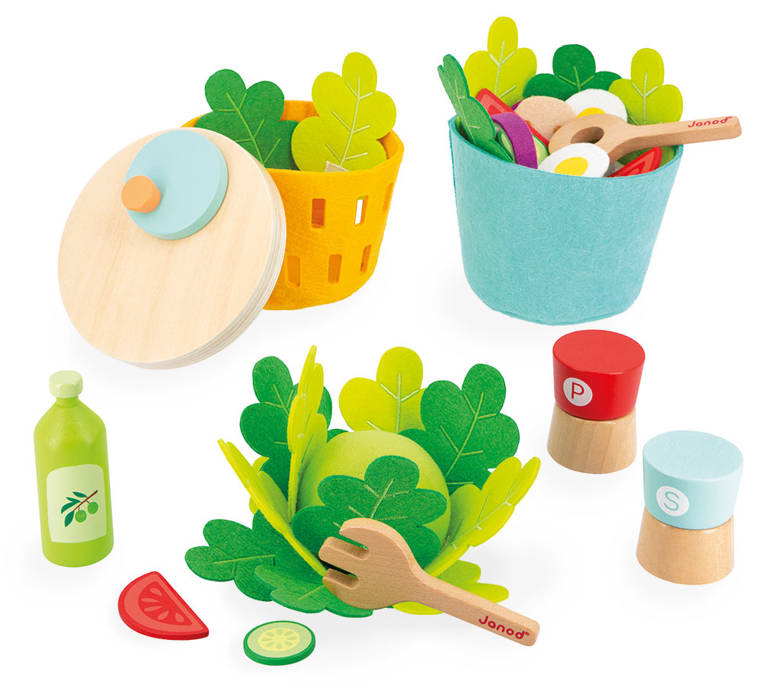 W skład 30-elementowego zestawu wchodzą: filcowa miska i filcowa suszarka z drewnianą pokrywką z pokrętłem, główka sałaty z 12 listkami, mocowanymi na rzepy, 3 plasterki pomidora, 2 plasterki ogórka, 2 plasterki cebuli, 2 jajka sadzone i 3 grzybki – wszystko wykonane z filcu, a także komplet sztućców do sałatek, drewniane pieprzniczka i solniczka z młynkami (wydają dźwięki) oraz butelka oliwy z oliwek.