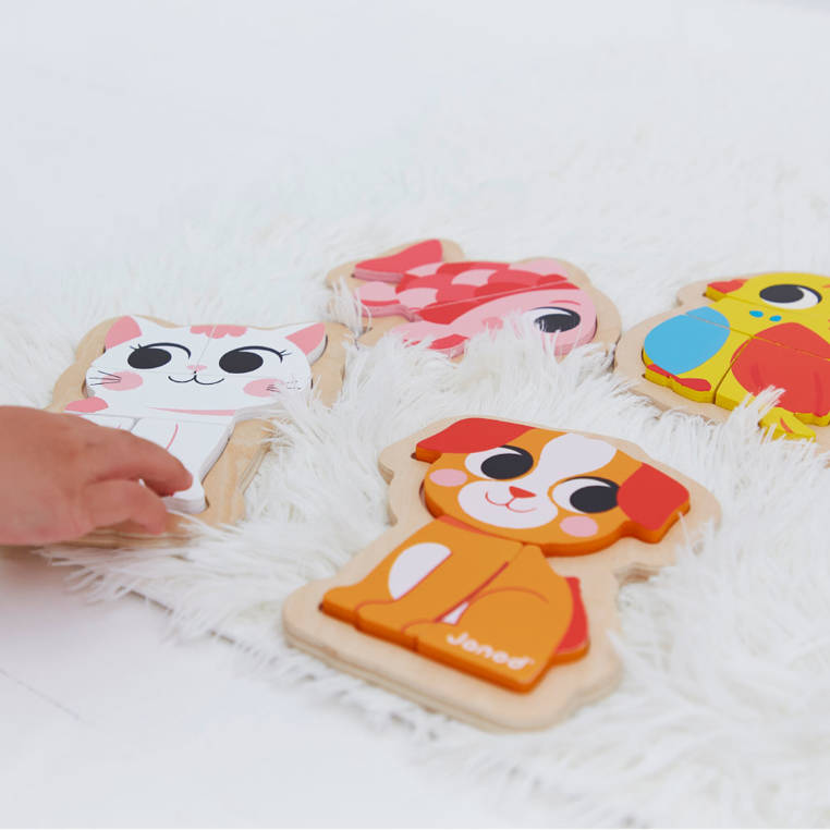Zestaw drewnianych puzzli progresywnych Zwierzęta domowe francuskiej marki JANOD składa się z 4 układanek o różnym stopniu trudności. Puzzle mają poręczną wielkość i kształty, a układa się je na drewnianych podstawkach.
