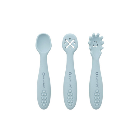 Miłe dla oka pastelowe kolory z pewnością zachęcą do próbowania swoich sił w samodzielnym jedzeniu posiłków. Wypustki na sztućcach stymulują sensorycznie i wspomagają naukę prawidłowego chwytania.