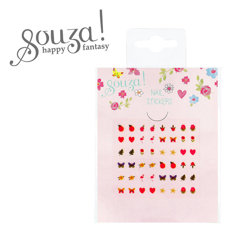 Zestaw naklejek na paznokcie Kwiaty holenderskiej marki Souza! W jego skład wchodzi 48 sztuk (24 pary) drobnych kształtów, m. in. kwiatków, flamingów i motyli w odcieniach różu, czerwieni i fioletu. Naklejki są nietoksyczne, nie podrażniają skóry, ani płytki paznokcia. Łatwo od niej odchodzą. Samoprzylepne ozdoby to bezinwazyjny i bezpieczny wybór dla dzieci zamiast tradycyjnych ozdób. Ponadto dzięki wielu elementom zestaw szybko się nie znudzi. Sprawdzi się także jako stylowy prezent.