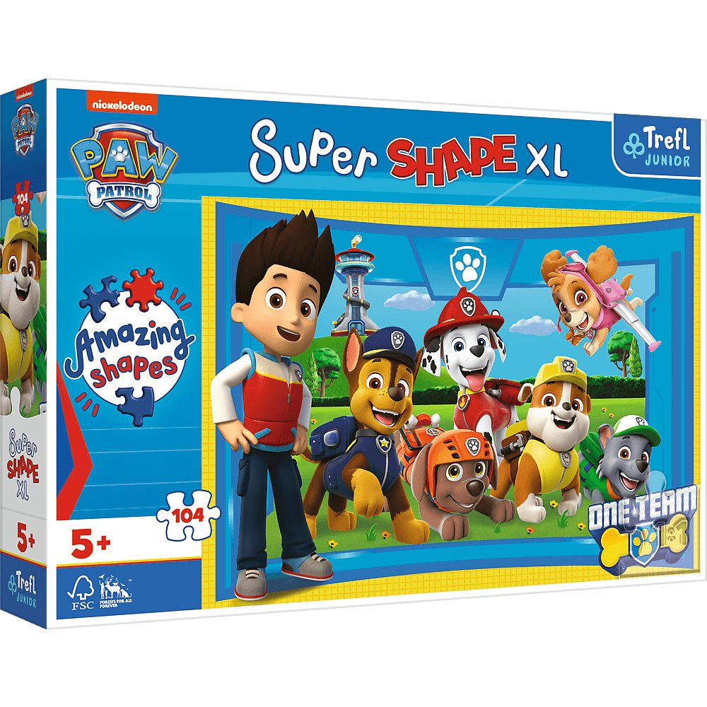 W świecie Psi przyjaciele to puzzle składające się z 104 dużych elementów, które zostały stworzone z myślą o wszystkich fanach i fankach Psiego Patrolu. Seria puzzli SUPER SHAPE to duże układanki z nieregularnymi kształtami. W układance poza klasycznymi puzzlami są elementy kształtowe.