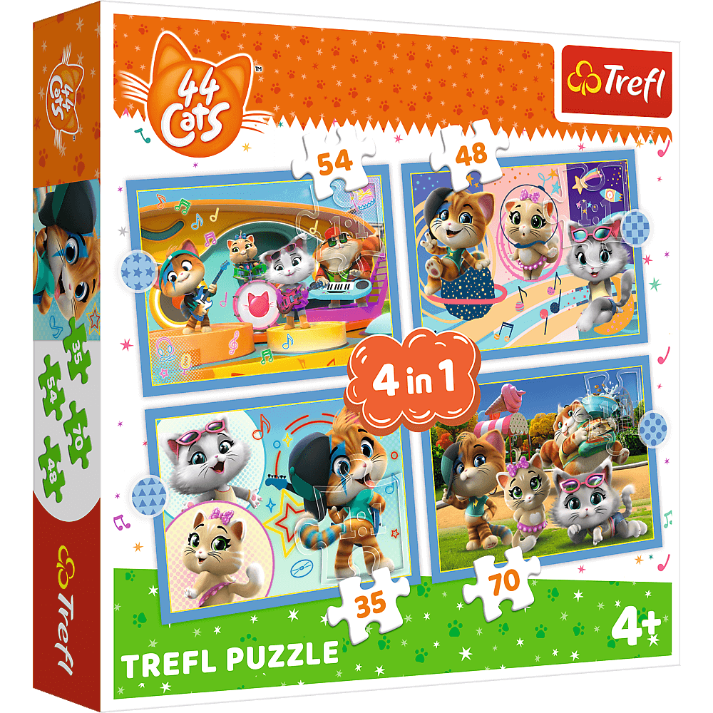Kocia ferajna to puzzle dla dzieci składające się z 4 niezależnych układanek, zaprojektowane z myślą o wszystkich fanach i fankach bajki 44 Cats. Po ułożeniu puzzli powstaną cztery obrazki o wymiarach 285 x 205 mm każdy. Zróżnicowana liczba elementów (35, 48, 54, 70) pozwala na zabawę zarówno młodszym, jak i nieco starszym fanom puzzli.