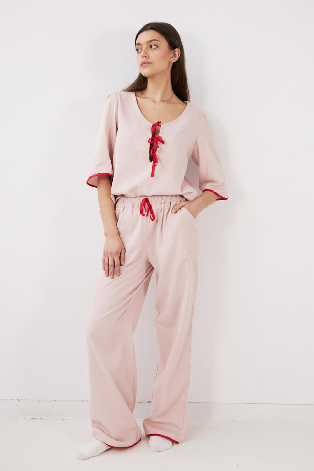 W skład zestawu wchodzą luźna koszula i spodnie. Koszula z szerokimi rękawami i delikatnymi bufkami na ramionach, a jej związywany na kokardki dekolt pozwala na karmienie piersią jeśli jesteś mamą. Krawędzie zdobi kontrastująca czerwona lamówka.