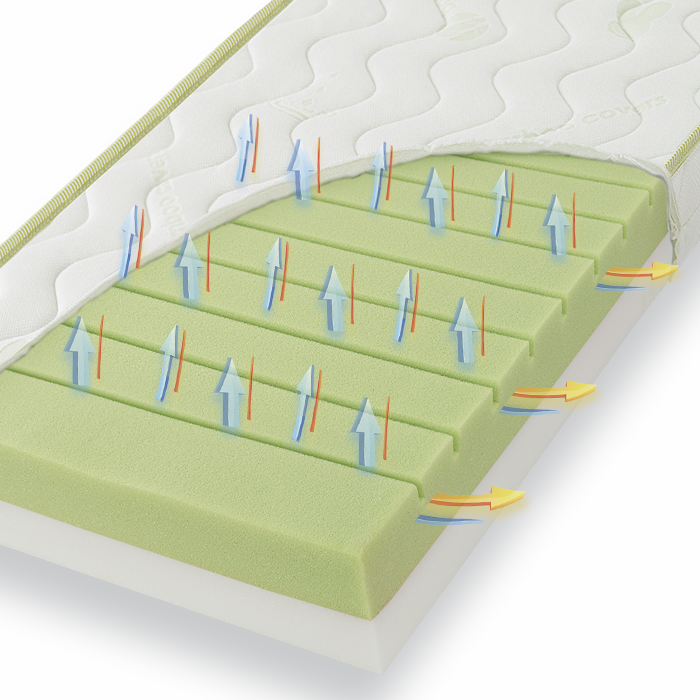 Poprzeczne i wzdłużne kanały wentylacyjne oraz wielopunktowe podparcie pleców zapewniają doskonałą cyrkulację powietrza oraz niepowtarzalny komfort snu podczas wypoczynku.