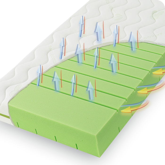 Poprzeczne i wzdłużne kanały wentylacyjne oraz wielopunktowe podparcie pleców zapewniają doskonałą cyrkulację powietrza oraz niepowtarzalny komfort snu podczas wypoczynku.