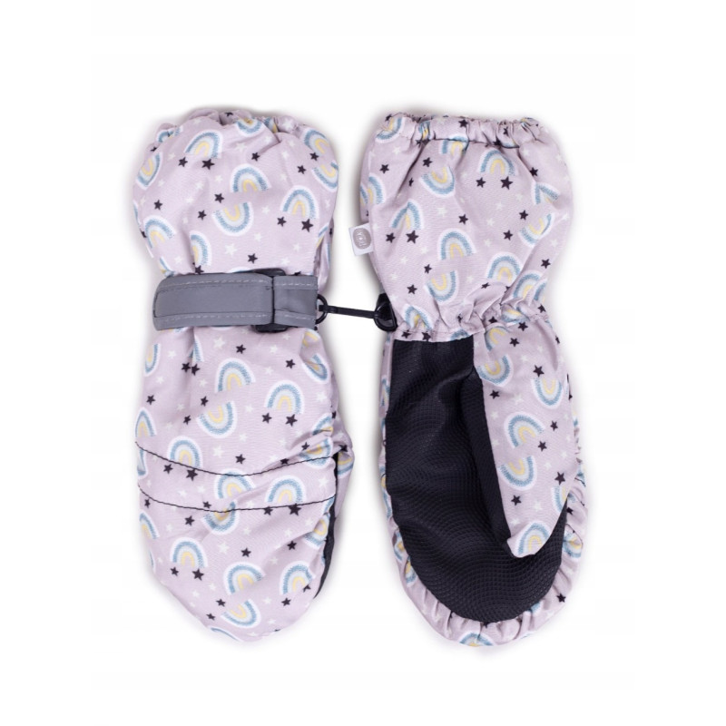 Narciarskie rękawiczki dziewczęce w kolorze jasnoszarym z motywem pastelowych tęcz. Na całości ozdobione drobnymi gwiazdkami. Wnętrze rękawiczki wykończone miłym polarem.