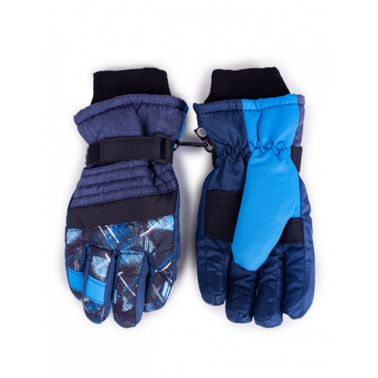 Narciarskie rękawiczki chłopięce w kolorze granatowo – niebieskim z ciekawym nowoczesnym wzorkiem. Wnętrze rękawiczki wykończone miłym polarem.Na nadgarstku zapinane na rzep, na górze zakończone dzianinowym ściągaczem, który zabezpiecza przed dostaniem się śniegu pod rękawiczkę. Na kciuku i wewnętrznej stronie dłoni posiadają dodatkową warstwę antypoślizgową ułatwiającą chwytanie. Rękawiczki narciarskie to obowiązkowe wyposażenie każdego miłośnika zimowego szaleństwa. Zapewniają dłoniom ciepło i suchość. Doskonałe do jazdy na nartach, snowboardzie czy sankach.