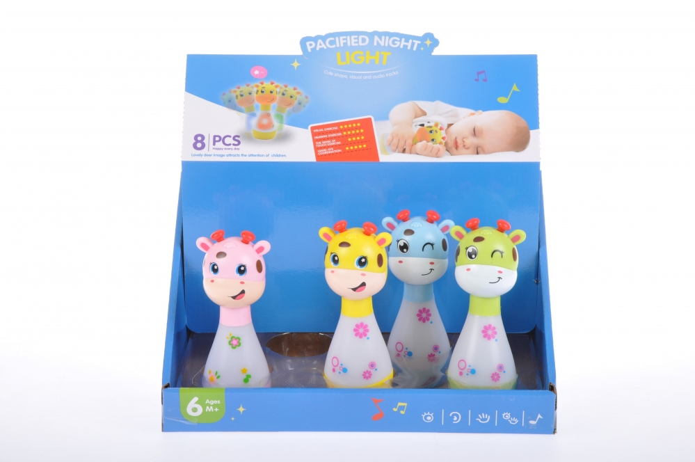 Kolorowa Żyrafka gra kojące melodie oraz świeci delikatnym światłem.