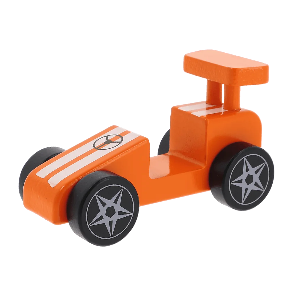 Zabawka drewniana Racing car Orange - wyścigówka z serii Wooden Toys to jedna z trzech pojazdów inspirowanych bajką Bobaski i Miś.