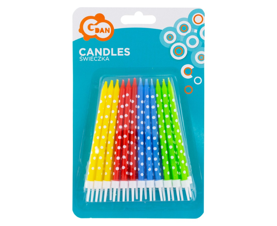 Świeczki urodzinowe, super dekoracja na tort dziecka. Świeczki w 4 kolorach ozdobione białymi grochami. W opakowaniu znajdują się 24 sztuki.