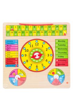 Zegarek posiada ruchome wskazówki dzięki czemu dziecko może uczyć się odpowiednich godzin, posiada uchwyt do powieszenia na ścianie, zegarek w formie tablicy na której znajdują się dodatkowo dni tygodnia, miesiące oraz pory roku w języku angielskim oraz liczby od 1 do 31.