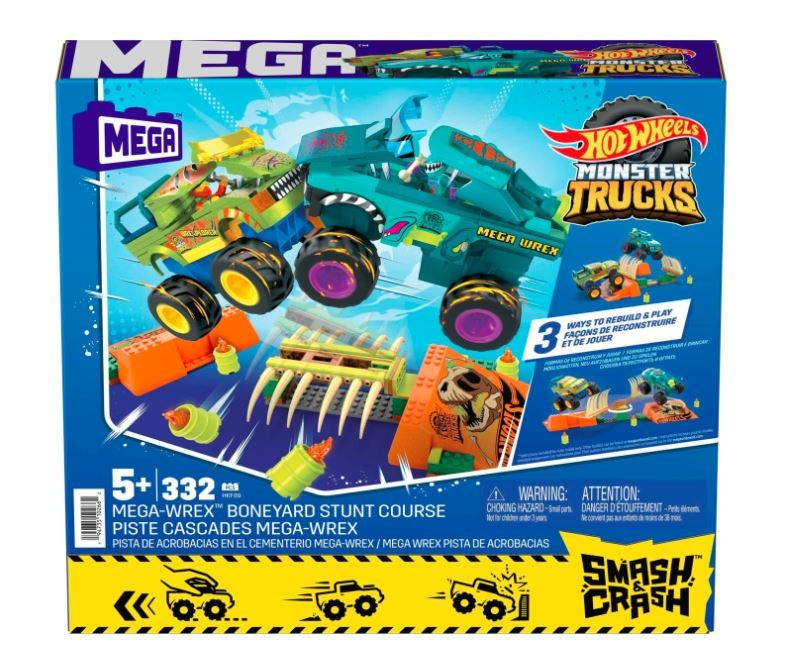 Przygotuj się na epicką demolkę z tym zestawem konstrukcyjnym Hot Wheels zawierającym Monster Trucki Mega-Wrex i Wrexplorer do zbudowania. Masz 3 sposoby na zbudowanie ramp i przeszkody. Ścigaj się, zderzaj i rób kraksy, odciągając pojazdy do tyłu i puszczając je, a potem patrz, jak elementy odpadają po uderzeniu! W zestawie są też 2 mikrofigurki, które można posadzić za kierownicą.