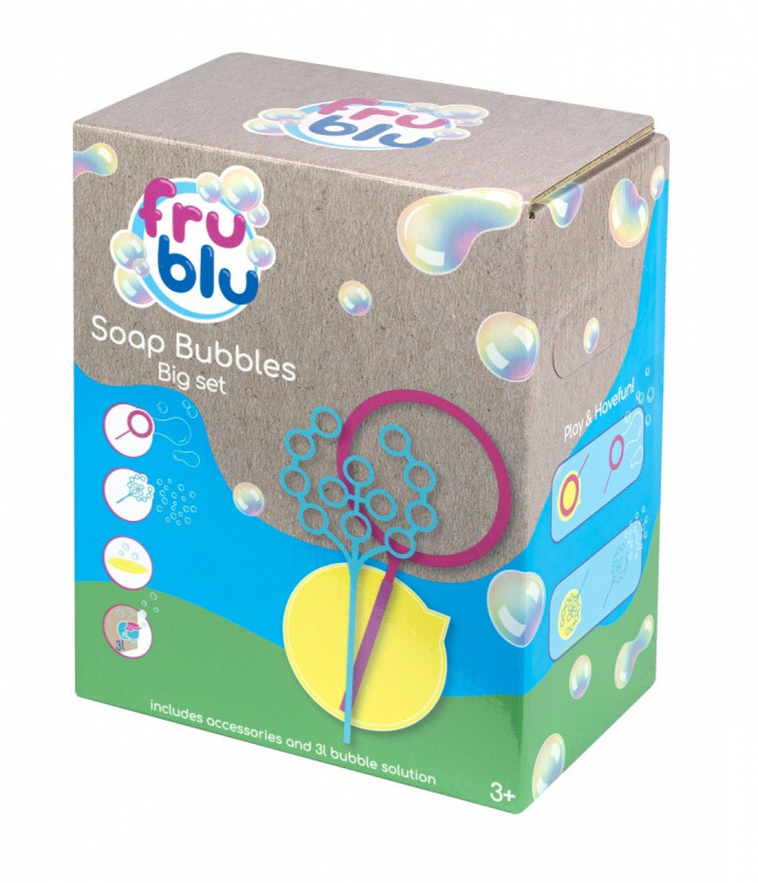 Fru Blu Eco 3l to połączenie doskonałej zabawy z dbałością o ekologię i komfort użytkowania. Zestaw zawiera obręcz, dającą możliwość tworzenia dużych baniek mydlanych, jak również obręcz w kształcie drzewka, która wytwarza efektowną chmurę drobnych baniek. Zróżnicowane akcesoria zapewnią długie godziny zabawy dla całej rodziny. Unikatowy system pakowania zapewnia wygodę użycia oraz przedłużoną trwałość płynu. Zastosowany typ zaworu jest najczęściej stosowany w opakowaniach Bag-in-Box ze względu na wyjątkową jakość, czyli niski wskaźnik wycieku produktu (mniej niż 1 na 55 milionów). Dzięki temu możliwe jest wydłużenie okresu przydatności do zabawy i trwałości produktu. Zastosowanie takich opakowań pozwala na oddzielenie worka foliowego i kartonu od siebie i wyrzucenie ich po zużyciu do właściwego pojemnika dla tego rodzaju odpadów. Zestaw zawiera: - dwa akcesoria (obręcz i drzewko), - talerzyk na płyn, - worek z płynem o pojemności 3 litrów.