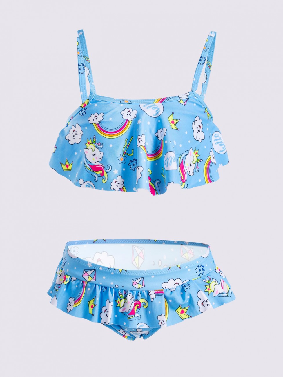 Śliczny, dwuczęściowy dziewczęcy kostium kąpielowy, w kolorze niebieskim. W roli głównej występują tu chmurki, tęcze i jednorożce. Stanik o prostym kroju, z przodu dłuższa falbanka. Wiązany z tyłu. Regulowane ramiączka pozwalają na indywidualne dopasowanie kostiumu do własnych potrzeb. Majteczki ozdobione uroczą falbanką.