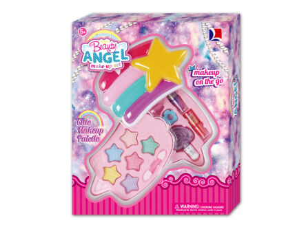 Malowidła w kształcie gwiazdki z tęczą. Zestaw zawiera: lakier do paznokci, spinkę, 2 rodzaje szminek, błyszczyk, 6 rodzai cieni do powiek. Produkt nie potrzebuje baterii. Zabawka przeznaczona dla dzieci powyżej 3 roku życia.