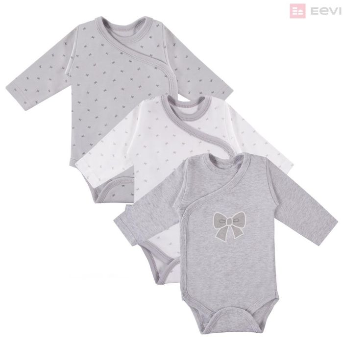 Body dziecięce Eevi - w zestawie 3 sztuki z długim rękawem, kopertowe w kolorze biało-szarym z nadrukami. Krój umożliwia rozpięcie na całej długości, dzięki temu body jest funkcjonalne i wygodne. Są wykonane z wyjątkowo miękkiego materiału. Rozmiar 62.