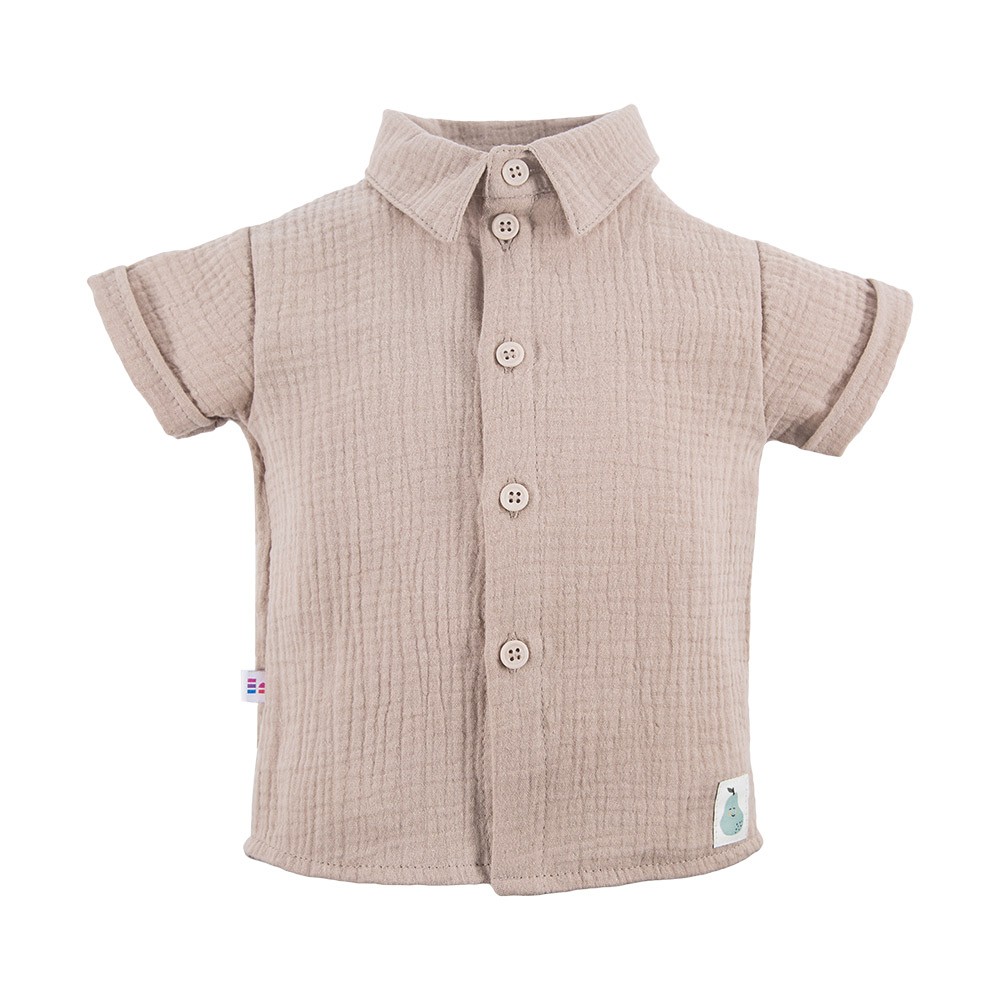 Beżowa koszula z krótkim rękawem. Muślin jest materiałem bardzo szlachetnym. Spawdzi się idealnie na lato oraz wiosnę. Jest przewiewny oraz oddychający. Zapobiega poceniu się skóry.