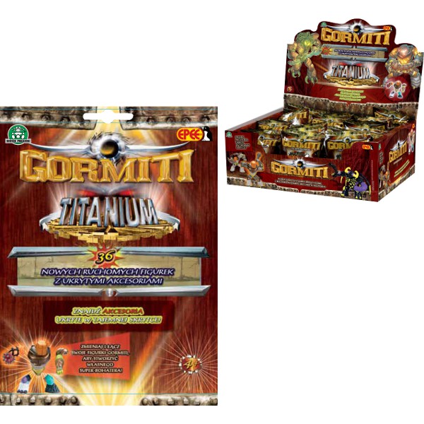 36 nowych figurek Gormiti Titanium, które mają ruchome części,a w środku figurki ukryte są mityczne akcesoria (maski, medaliony, pierścieniemocy, bronie mocy żywiołów), które wzmacniają naszych bohaterów w obronie wyspy Gorm.
