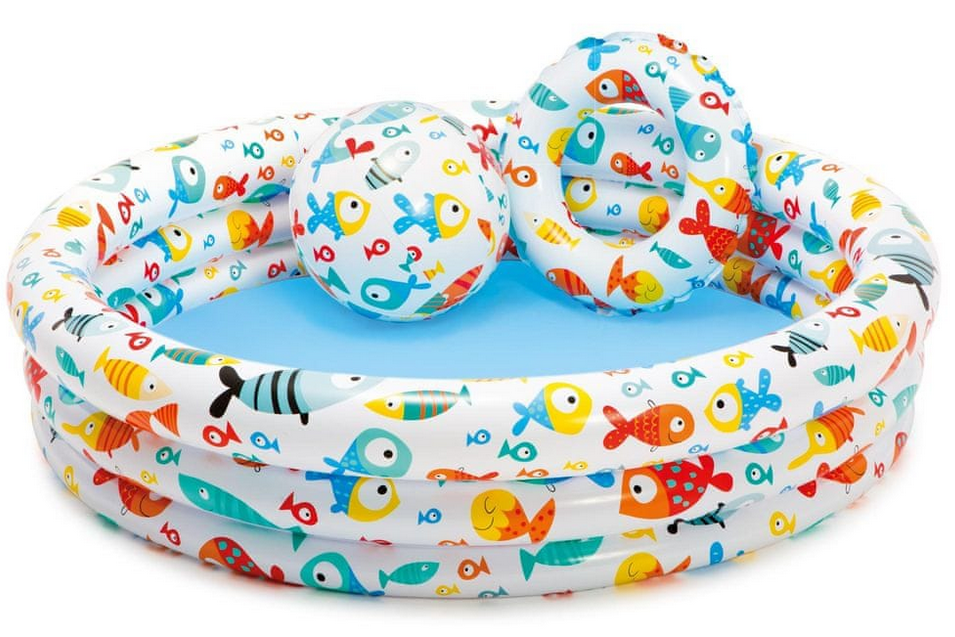 Dmuchany basen, kółko oraz piłka z ozdobione różnymi, kolorowymi motywami zapewnią dzieciom mnóstwo rozrywki i umilą czas spędzony w ogrodzie.