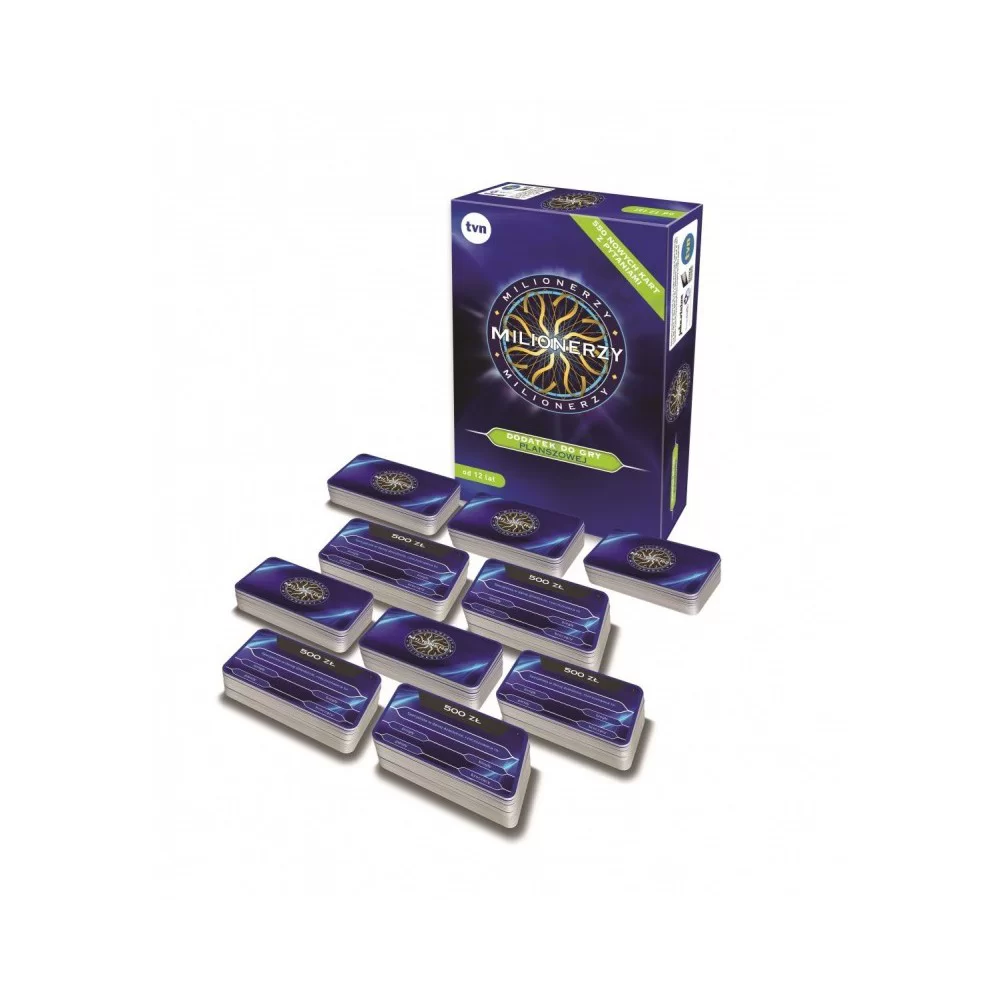Dodatek do Gry Milionerzy. Posiadając dodatek do gry i wersję podstawową gry Milionerzy, możesz grać aż 1210 kartami Pytanie i Odpowiedzi. Milionerzy to nowa, polska edycja gry planszowej, oparta na popularnym na całym świecie teleturnieju. Zawarte w zestawie pytania pochodzą z programu telewizyjnego, emitowanego w TVN. Celem graczy jest odpowiedź na wszystkie 12 pytań i zyskanie tytułu milionera. Zostań graczem lub prowadzącym "Milionerów", pełne napięcia chwile i fantastyczne emocje w gronie przyjaciół masz zagwarantowane! Zmierz się z zupełnie nowymi pytaniami i wygraj milion! Ten dodatek nie jest samodzielną grą! Do pełnej rozgrywki z planszą potrzebna jest wersja podstawowa gry planszowej Milionerzy.