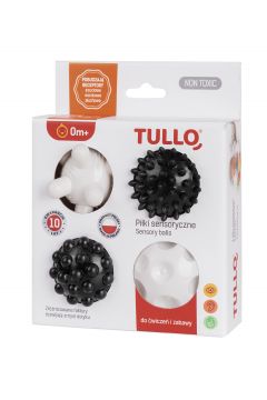 Zestaw czterech miękkich piłek sensorycznych przeznaczonych do ćwiczeń integracji sensorycznej oraz zabawy. Każda piłka posiada inny rozmiar i inną fakturę, dzięki czemu dostarcza różnych wrażeń czuciowych. Piłeczki sensoryczne Tullo są polecane przez fizjoterapeutów do masażu niemowląt, w celu rozluźnienia napięcia mięśniowego. Czarno- białe zestawienie kolorystyczne idealnie stymuluje zmysł wzroku u niemowlaka, który nie rozróżnia jeszcze barw. Piłki sensoryczne Tullo nie posiadają dziurki, dzięki temu świetnie sprawdzają się podczas kąpieli. Woda nie przedostaje się do środka, a dzieci mają kontakt tylko z zewnętrzną warstwą zabawki. To jeszcze więcej higieny dla Twojego malucha. Dostarczają wrażeń dotykowych przez zastosowanie różnych struktur materiału, co usprawnia precyzyjne ruchy dłoni i palców, pobudzają receptory czuciowe, masaż piłeczkami rozluźnia napięcie mięśniowe, pobudzają zmysł wzroku, są niezastąpione w okresie raczkowania, maluch może turlać piłki, sprawdzają się również w okresie ząbkowania, ponieważ faktury piłek masują dziąsła, idealne do zabawy podczas kąpieli.