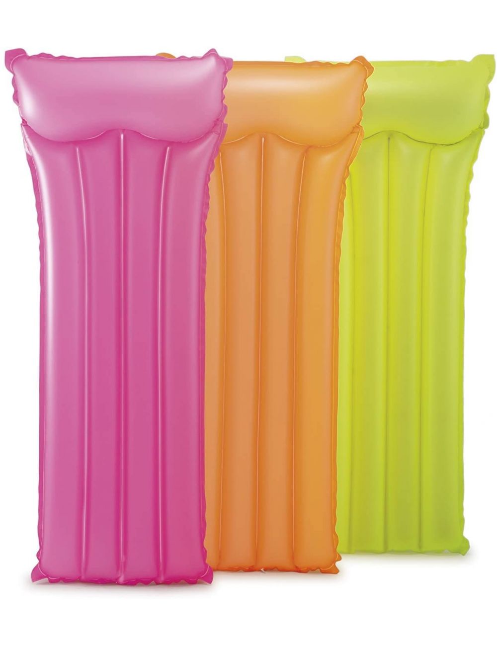 Materac dmuchany wyprodukowany przez firmę INTEX. Idealny do basenu ogrodowego i wypoczynku nad wodą. Wykonany z mocnego tworzywa. Neonowy kolor - wysyłka losowa. Mocny winyl z którego został wykonany materac jest odporny na przetarcia i promienie UV. 183x76 cm.
