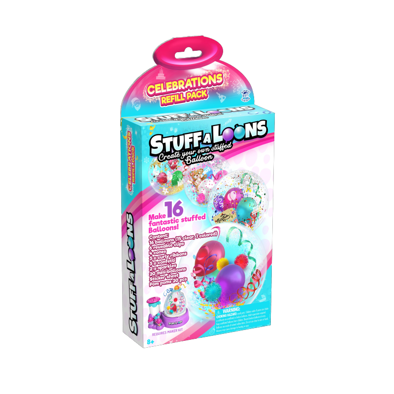 Wraz z pakietem Celebrations otrzymujesz 16 dodatkowych balonów Stuff-A-Loons, z których 15 jest przezroczystych i 1 kolorowy, oraz wiele świątecznych dekoracji, takich jak pompony, ozdobne wstążki, naklejki, konfetti, mini balony i brokat. Uwaga: do napełnienia balonów potrzebujesz stacji Stuff-A-Loons Maker.