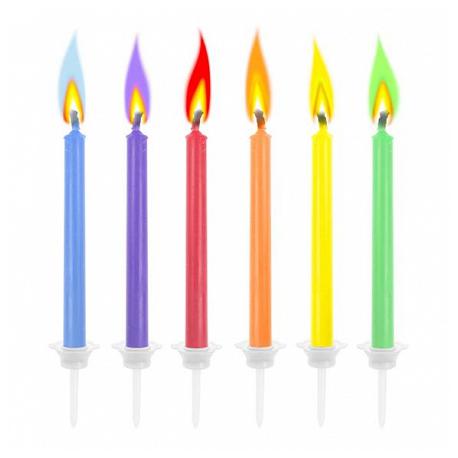 Świeczki urodzinowe z kolorywymi płomieniami.