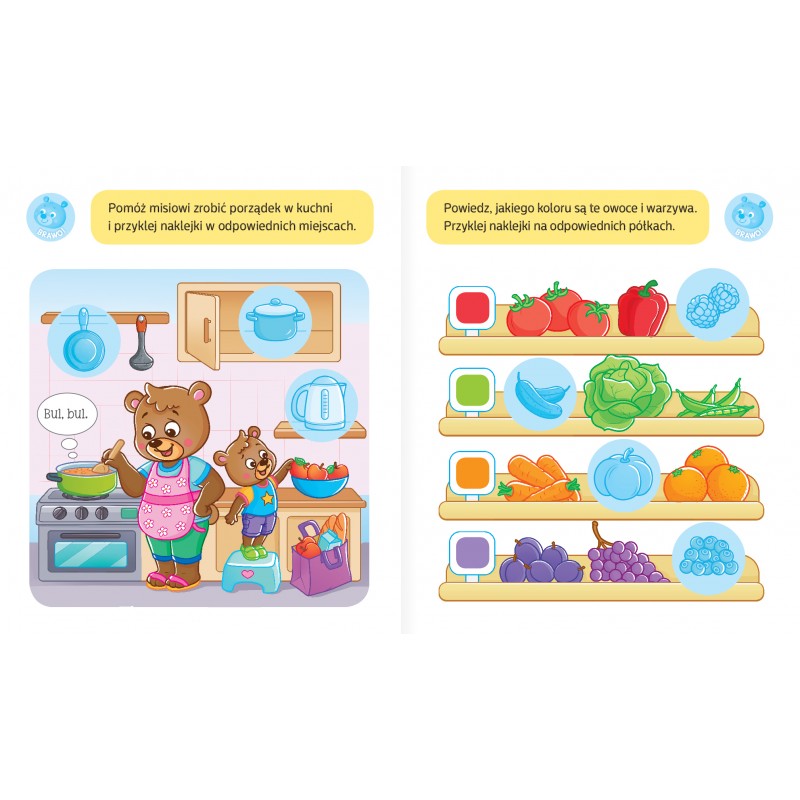 Dzieci, bawiąc się naklejkami i wypełniając proste zadania, pomagają małemu misiowi rozwiązywać jego problemy, a przy okazji same w przyjaznej atmosferze uczą się, jak korzystać z nocniczka, jak dbać o higienę, poznają przedszkole, uczą się ubierać i odpowiednio odżywiać.
