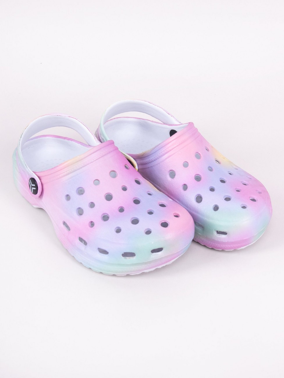 Letnie klapki dziewczęce kroksy w pastelowych, tęczowych kolorach. Można je nosić na dwa sposoby: jako klapki lub sandałki, a założony wówczas na piętę pasek, zapobiegnie przypadkowemu zsuwaniu się obuwia ze stopy.