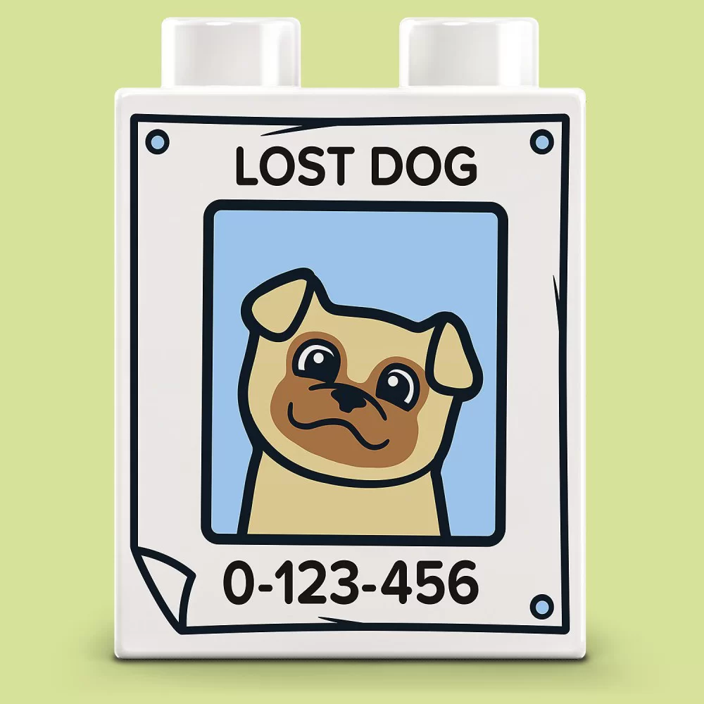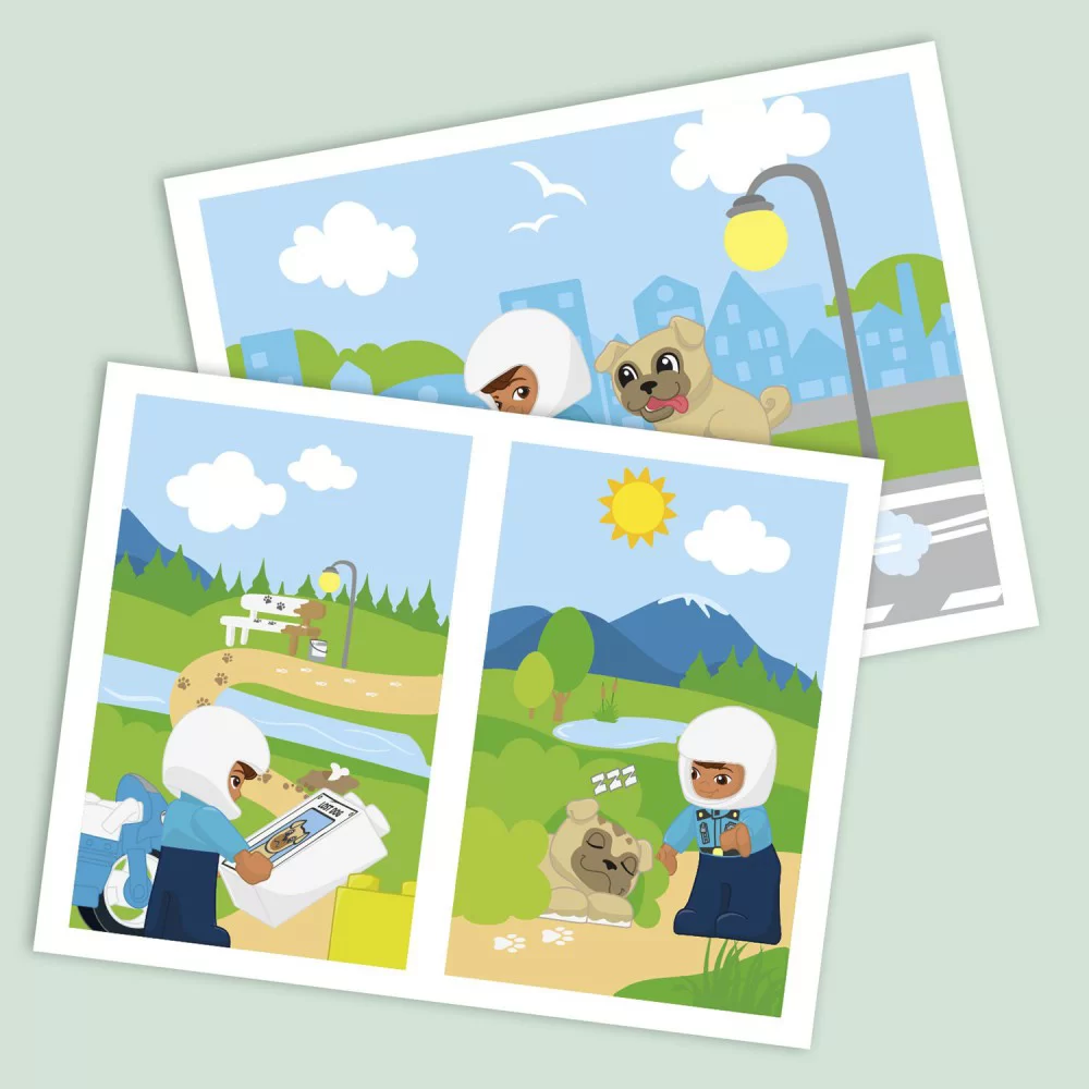 Inspiruje do twórczej zabawy — w zestawie znajdziesz dwie figurki LEGO DUPLO — policjanta i ślicznego pieska — a do tego plakat z informacją o zaginionym psiaku oraz jasnoniebieski motocykl, na którym zmieści się policjant z psem.