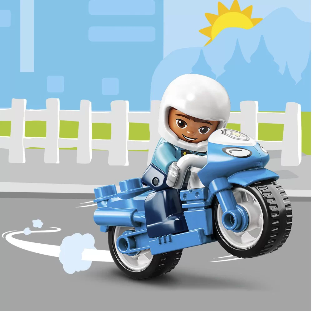Zestaw LEGO DUPLO Rescue Motocykl policyjny do praktycznej, rozwijającej zabawy zachwyci każdego malucha w wieku od 2 lat, który interesuje się pracą policji, fajnymi motocyklami albo opieką nad zwierzętami.