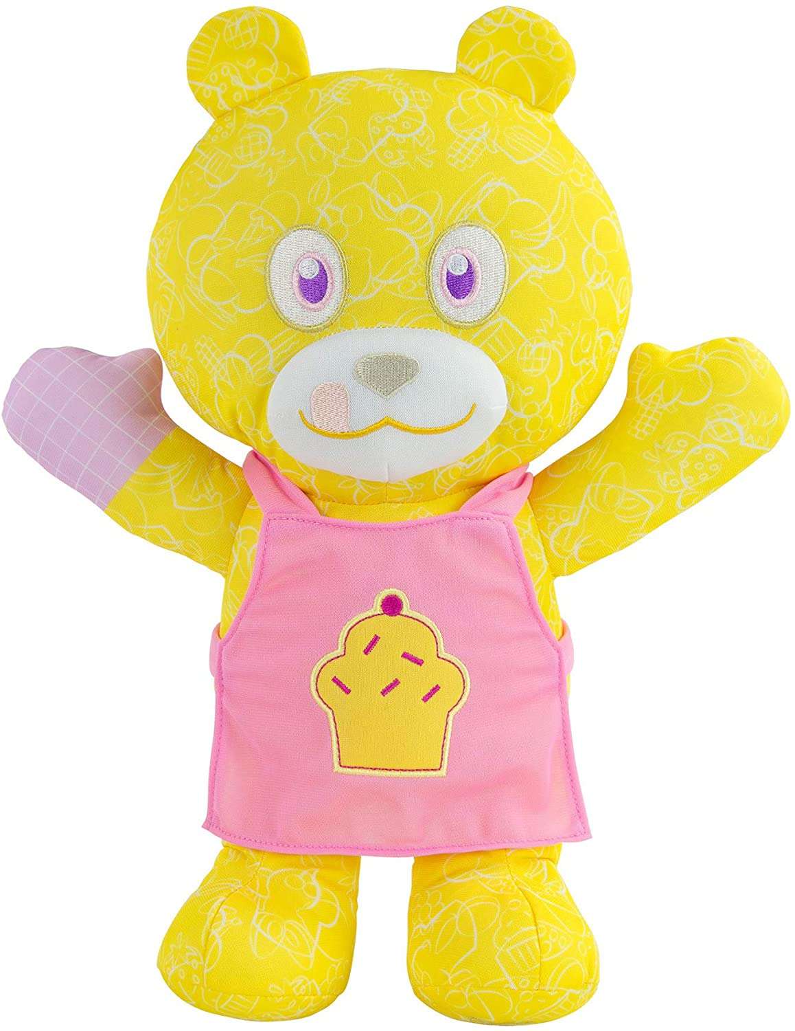 Zabawka jest w kolorze żółtym. Materiał pokrywają białe wzorki, na brzuszku ubrany jest w różowy fartuszek z babeczką, a na nóżce wyhaftowaną głowę misia. Oczy misia są w kolorze różowym.