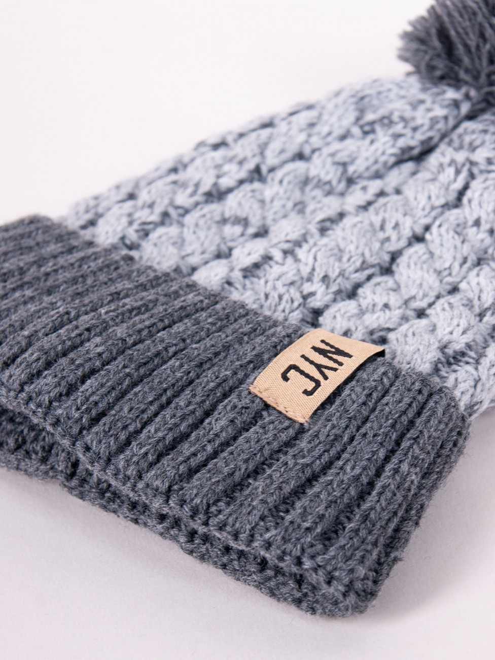 Zimowa czapka dla chłopca w kolorze szarym. O grubszym, warkoczowym splocie. Na górze znajduje się milutki pompon z frędzli. Zakończona ściągaczowym wywinięciem, na którym widnieje naszywka z napisem: NYC. W środku posiada bawełnianą podszewkę.