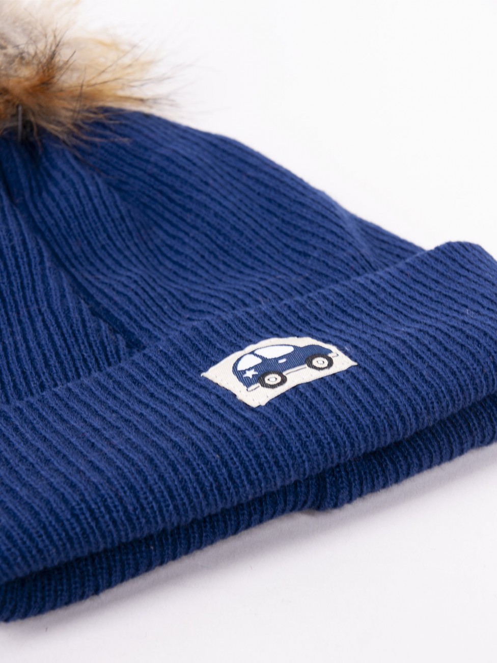Zimowa czapka dla chłopca w kolorze granatowym, o delikatnym splocie. Zakończona wywinięciem, na którym widnieje naszywka z autem. W środku posiada bawełnianą podszewkę.